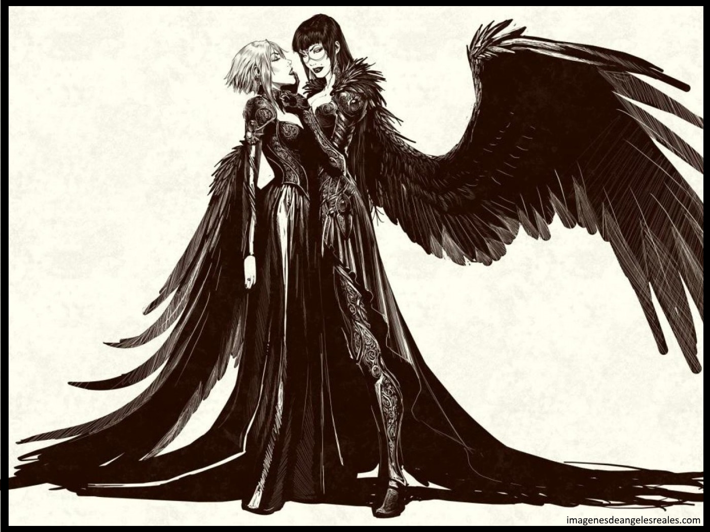Otra de las imágenes nos muestra a dos mujeres angeles muy cerca la una de la otra, en otra de las imágenes vemos a un ángel cambiando de color ya que tiene una ala blanca y otra negra.